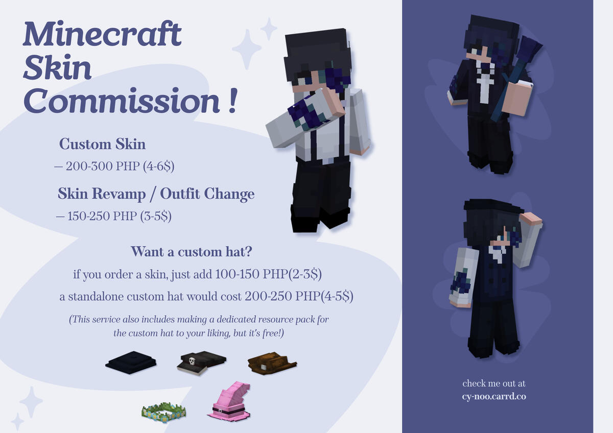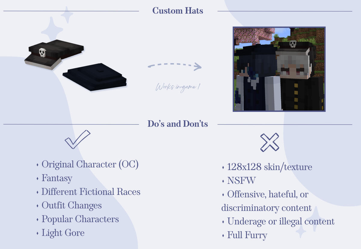 • I retain all copyrights and the right to display the skin and custom hats in my portfolio and social media unless requested otherwise.